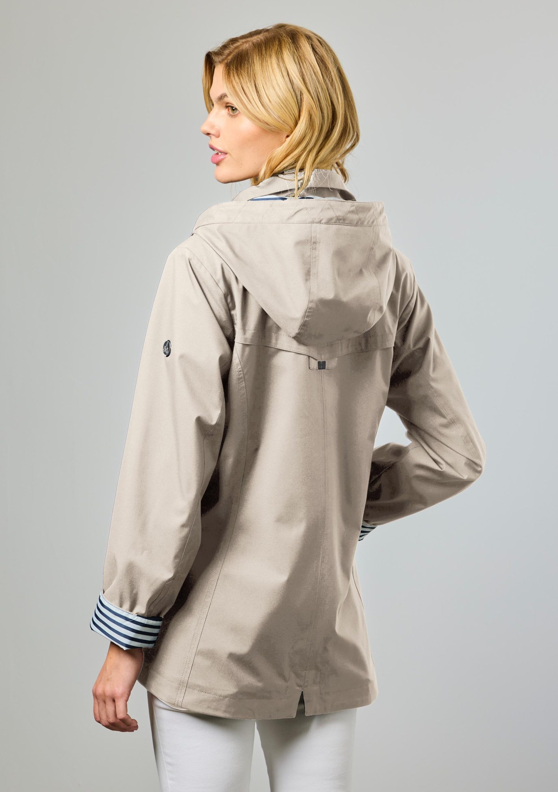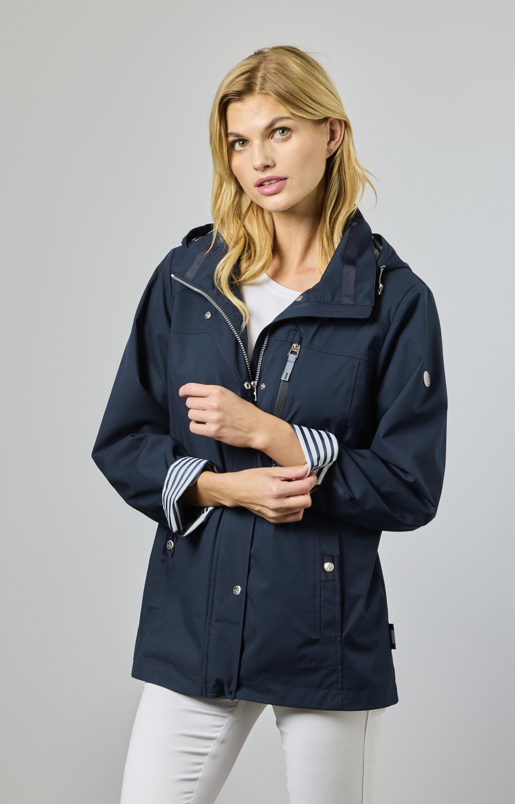 Takissa on irroitettava huppu, vetoketju- ja nepparikiinnitys edessä. Hihansuussa ja hupussa sininen-valkoinen raitavuori tuo raikasta ilmettä.